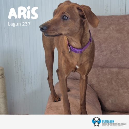 Aris es una podenca de tamaño pequeño, muy sociable y juguetona.